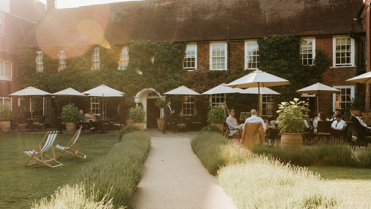 At its centre stands The Bush: a 17th-century coaching inn that has quietly watched the centuries pass, evolving without ever losing itself. From the rear entrance, it resembles a country estate more than a town hotel. Ivy spills across its Georgian brickwork, the garden flanked by manicured hedges and quiet gravel paths. The rear garden is generous, with pines, roses, benches, and loungers. A few guests are reading on benches, others linger over lunch at tables under parasols, children stretching their legs across the lawn. The high street hums just beyond the building’s other side, but here you’d never know it. The noise of traffic is gone, replaced by birdsong and breeze. It’s a rare architectural trick: the sense of remove without the inconvenience of remoteness.